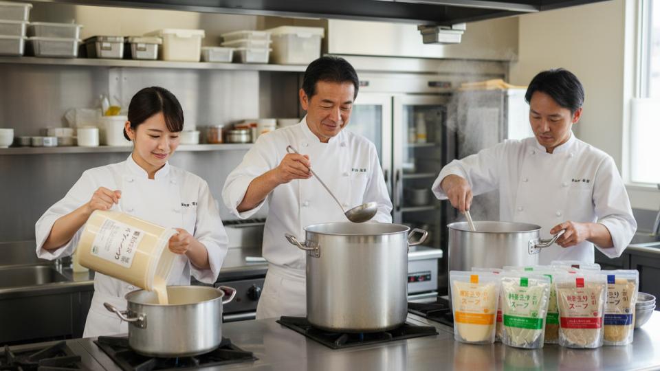 長年にわたり多くの顧客に愛され続けている、そのレストランならではのこだわりの味や、特定の地域で親しまれている特徴的なスープ(例えば、沖縄のステーキハウスで提供される濃厚なクリームスープや、フレンチレストランの伝統的なオニオングラタンスープなど)を、高品質な業務用ベーススープを巧みに活用することで、その再現性を高めることが可能になります。 これらのベーススープは、それ自体で完成された味わいを持つものも多いですが、さらに隠し味の追加や、新鮮な食材のトッピング、あるいは独創的な盛り付けといったアレンジを加えることで、オリジナリティあふれる一杯へと昇華させることができます。 これにより、シェフの創造性を発揮しつつ、長年のファンが求める安定した美味しさを、プロフェッショナルな選択肢として提供し続けることができるのです。